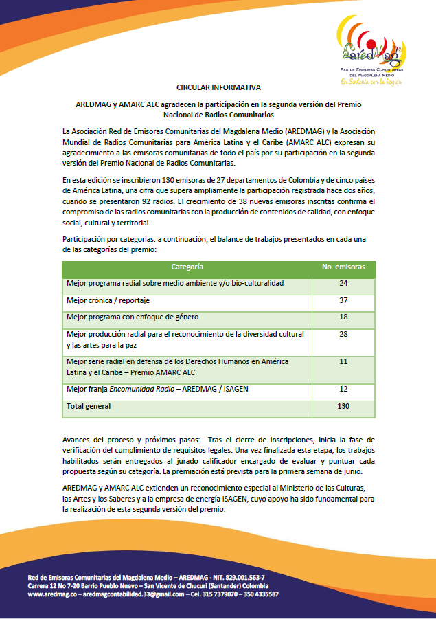 Desde AREDMAG y AMARC ALC expresamos nuestro más sincero agradecimiento a todas las emisoras comunitarias que hicieron parte de la segunda versión del Premio Nacional de Radios Comunitarias.